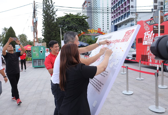 “Bức Tường Gắn Kết” – biểu tượng của sự sẻ chia và đồng lòng : Thể hiện tinh thần đồng hành cùng cả nước hướng về các địa phương chịu thiệt hại do thiên tai, SABECO đã triển khai “Bức Tường Gắn Kết” tại mỗi điểm dừng của “Hành Trình Di Sản” để người tham dự có thể gửi gắm tình cảm và lời động viên đến chính quyền địa phương, lực lượng tuyến đầu, các tình nguyện viên và người dân đang nỗ lực phục hồi cuộc sống sau bão lũ. Tại khu vực này, người tham dự cũng được khuyến khích tham gia hoạt động tương tác và chia sẻ hình ảnh cùng lời chúc của mình lên mạng xã hội kèm hashtag “Cùng Việt Nam Kiên Cường”, nhằm lan tỏa tinh thần đồng cảm và sự gắn kết đến cộng đồng trên khắp cả nước. Mỗi lời nhắn, mỗi bài đăng không chỉ là một lời động viên, mà còn là một mảnh ghép của tinh thần Việt Nam kiên cường, thể hiện niềm tin về sự đoàn kết vượt qua mọi khó khăn.