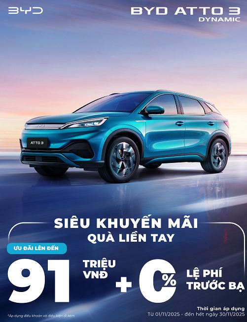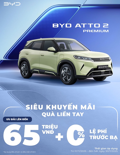 BYD Việt Nam chính thức khởi động chương trình ưu đãi đặc biệt mang tên “Siêu khuyến mãi – Quà liền tay”, áp dụng từ nay đến hết ngày 30 tháng 11 năm 2025 trên toàn hệ thống đại lý BYD Việt Nam. Trong thời gian diễn ra chương trình, từ nay đến hết ngày 30 tháng 11 năm 2025, khách hàng mua một trong các mẫu xe năng lượng mới BYD ATTO 2, BYD ATTO 3, BYD SEAL 5, BYD M6, BYD SEALION 6, BYD SEAL, BYD HAN, BYD SEALION 8 sẽ được hưởng ưu đãi hấp dẫn, từ tiền mặt đến quà tặng trang bị đặc biệt dành cho xe.