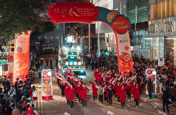 Dẫn đầu chuỗi chương trình lễ hội đặc sắc là sự kiện diễu hành đêm “Cathay International Chinese New Year Night Parade” do Tổng cục Du lịch Hồng Kông tổ chức, chính thức khởi động không khí đón Tết Bính Ngọ. Cuộc diễu hành năm nay mang chủ đề “Best Fortune.World Party”. Vào tối ngày mùng 1 Tết Nguyên đán (17 tháng 2), tổng cộng 60 xe hoa và đoàn biểu diễn sẽ tạo nên bữa tiệc lễ hội mang đẳng cấp quốc tế tại Tiêm Sa Chủy, giao lưu và tương tác với đông đảo người dân địa phương cũng như du khách, cùng lan tỏa những lời chúc năm mới rộn ràng.