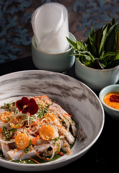 Mâm cơm đoàn viên mở đầu bằng sự tươi mới với Gỏi cá mai tái chanh, trộn với trái tầm bóp, hành tây và rau thơm. Kỹ thuật chế biến cá mai từ Vietnam House Restaurant giúp giữ trọn độ tươi ngọt, dai giòn và béo nhẹ, hài hòa với vị chua thanh đặc trưng của trái tầm bóp và các loại rau thơm bản địa. Món gỏi mang đến trải nghiệm vị giác cân bằng, tạo nên một khởi đầu hứng khởi cho bữa ăn sum vầy.
